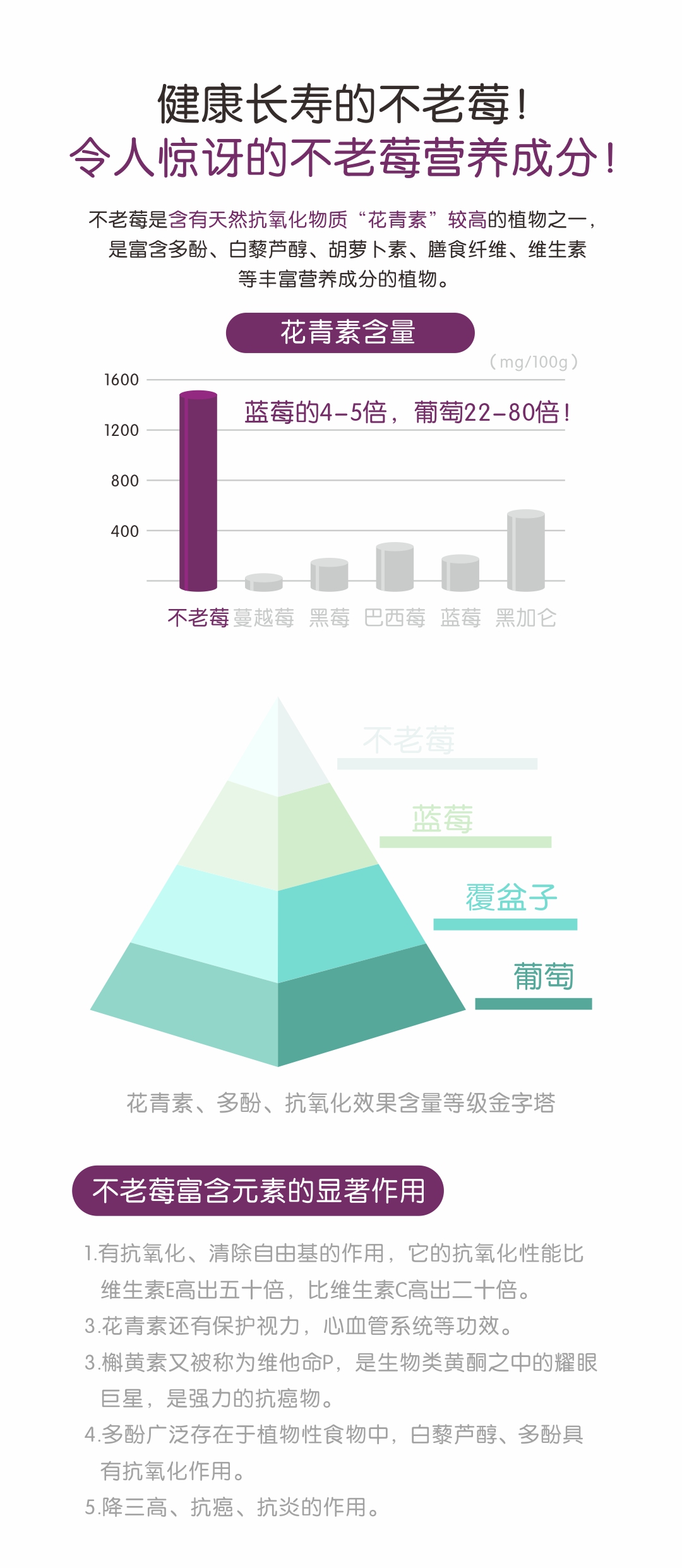 不老莓含有大量的天然抗氧化物:花青素、白藜芦醇、多酚;富含胡萝卜素、膳食纤维、维生素(如B族维生素、维生素E、维生素C)、硒、维他命P等丰富营养成分的植物。