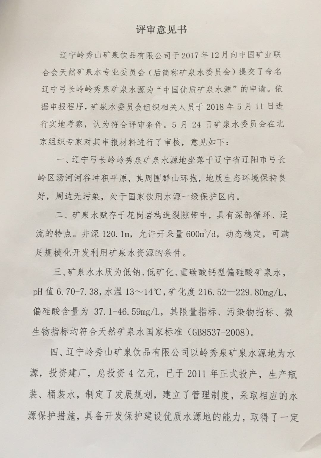 此次岭秀泉天然矿泉水源申报中国优质矿泉水源的评审专家由建筑部科技委国务院资深参谋、勘测大师王秉忱,中国工程院、中国矿业大学院士教授武强,中国地质科学院水文地质环境地质研究所、原国家天然矿泉水技术评审组研究员安可士,中国矿联天然矿泉水专业委员会、原国家天然矿泉水技术评审组秘书长廖雷,吉林省国土资源厅教授级高工、原副厅长滕继奎,中国矿联地热专业委员会常务副主任宾德智,原辽宁省矿业协会秘书长、教授级高工张清印,长白山天然矿泉水研究中心、中国矿联天然矿泉水专业委员会主任、副主任委员李印锡,昆仑山矿泉水有限公司、中国矿联天然矿泉水专业委员会总经理、副主任委员庞振国,西藏冰川矿泉水有限公司、中国矿联天然矿泉水专业委员会副总经理、副主任委员王华,中国矿联天然矿泉水专业委员会技术专家组副组长黄伟,四川蓝剑饮品集团、中国矿联天然矿泉水专业委员会执行总经理、副秘书长王斌,醴云矿泉水有限公司、中国矿联天然矿泉水专业委员会董事长、理事张伟,苏州普虑得净化股份有限公司、中国矿联天然矿泉水专业委员会董事长、理事葛明明审评。