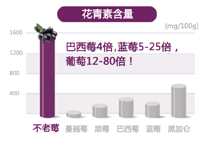 不老莓作为健康食品受到广泛关注,其中一个重要原因就是它的功效,不老莓含有的花青素是强大的抗氧化物质。其花青素的含量是蓝莓的5~25倍,而且除了花青素之外还含有大量多酚,据波兰华沙大学研究结果表明:不老莓的多酚含量是葡萄的80倍,覆盆子的20倍,蔓越莓的13倍。